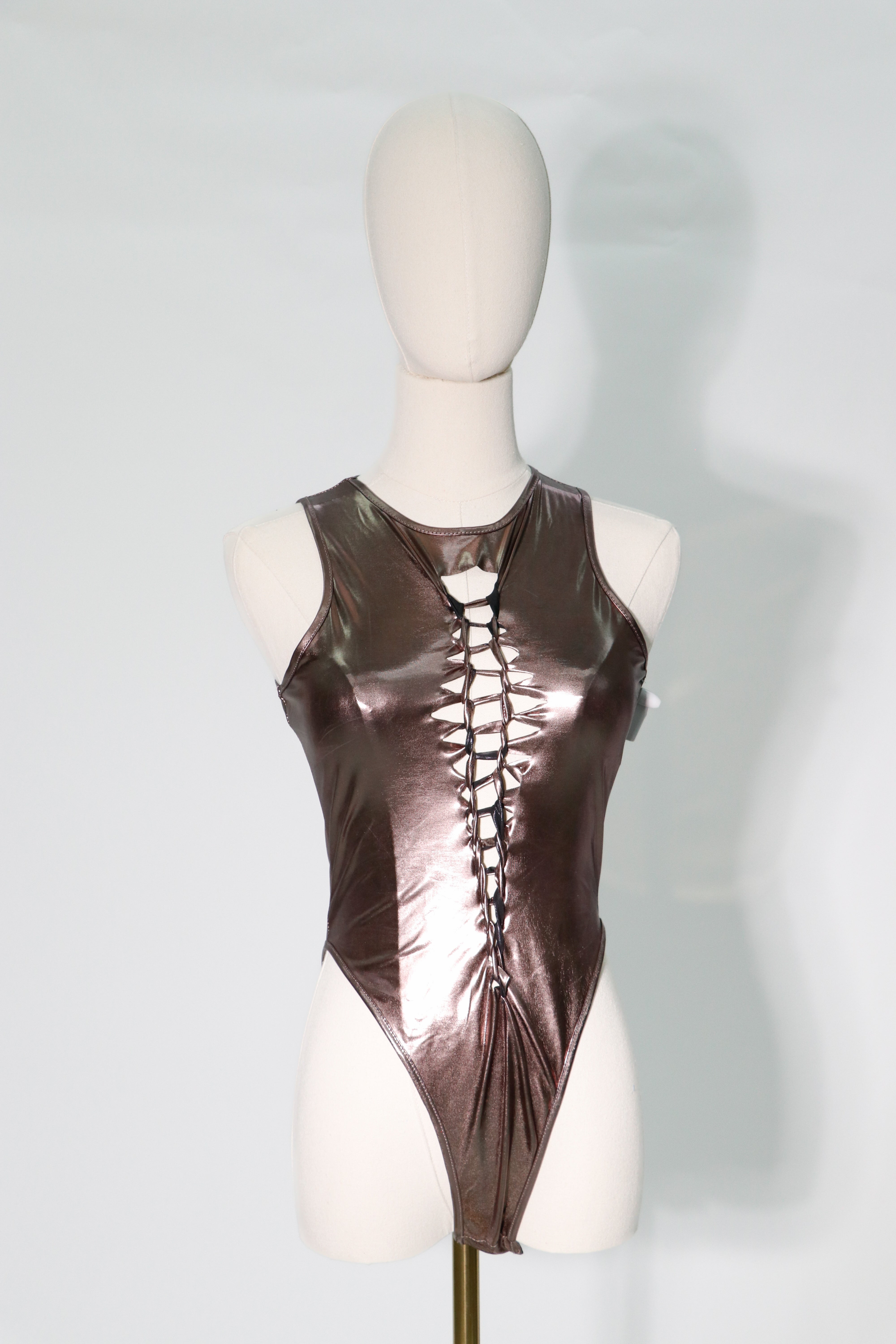 our stretchy metallic brown bodysuit. This edgy and playful body suit will hug your curves and give you the confidence to rock any event.